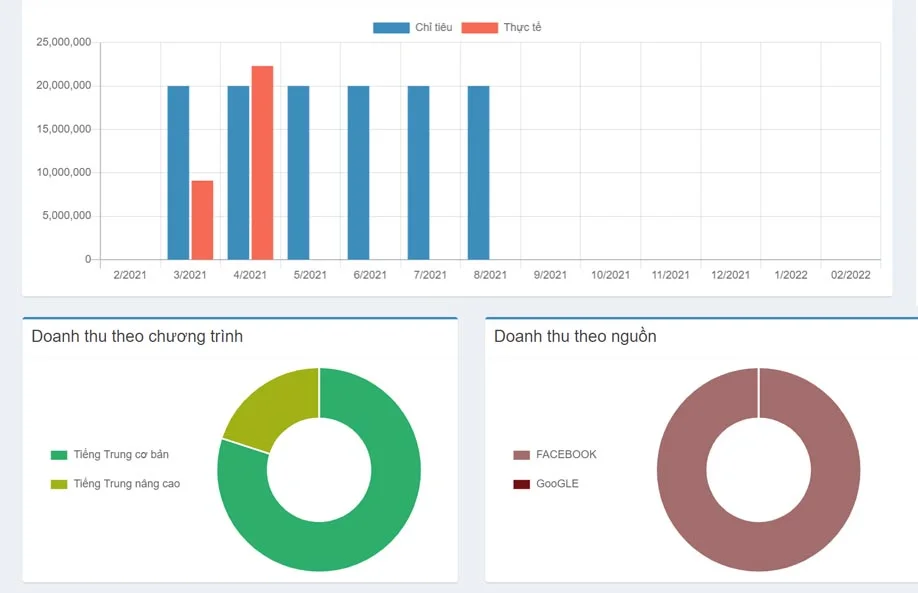 Hệ thống biểu đồ trực quan về doanh thu, tỷ lệ học viên hài lòng và
